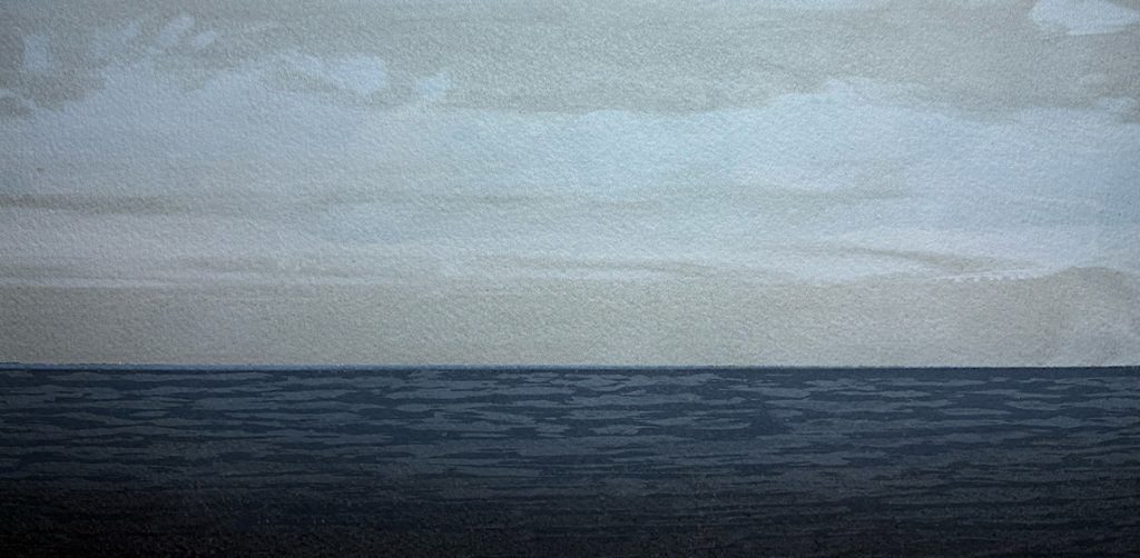 These images evolve slowly as layers accumulate, capturing the experience of shifting skies and the changing nature of light on the land and sea when walking. Monoprint techniques combine with multiple photographic and stencilled layers, creating variable editions where the accumulation of layered mark making accentuates the physicality of each work.